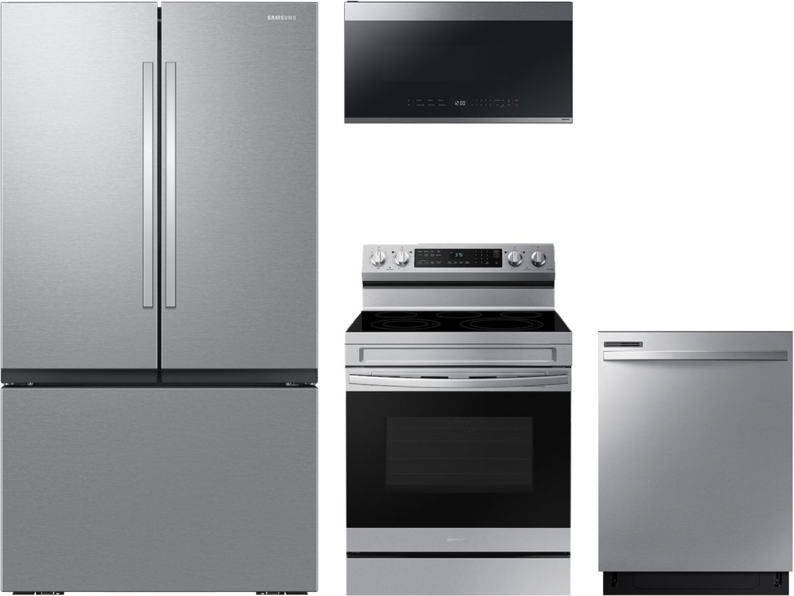 Samsung® 4 Piece Kitchen Package with stainless steel French door refrigerator, freestanding electric range, built in dishwasher and over the range microwave.Read More