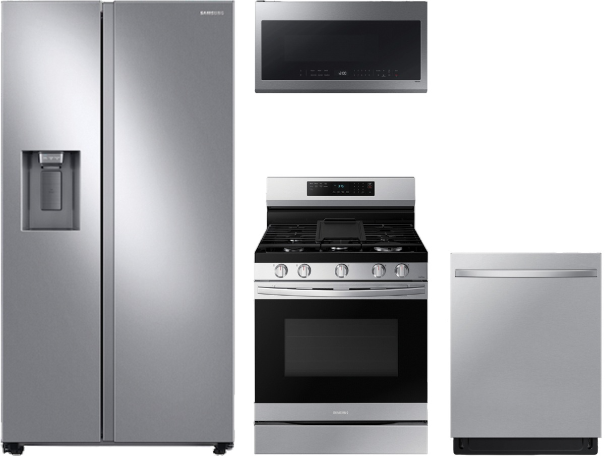 Samsung 4 Piece Fingerprint Resistant Stainless Steel Kitchen Package with Steel side-by-side refrigerator, built in dishwasher, freestanding gas range, and over the range microwave.Read More