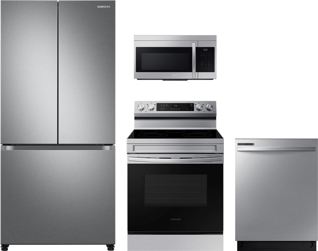 Samsung 4 Piece Stainless Steel Kitchen Package with a french door refrigerator, built in dishwasher, freestanding electric range, and over the range microwave.Read More
