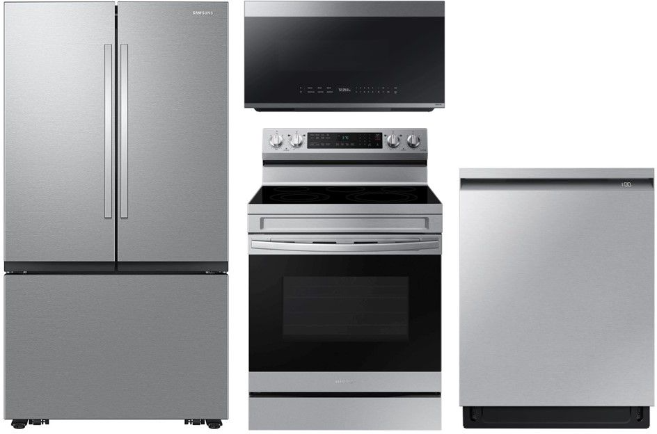 Samsung 4 Piece Stainless Steel Kitchen Package with French door refrigerator, freestanding electric range, built in dishwasher and over the range microwave.Read More