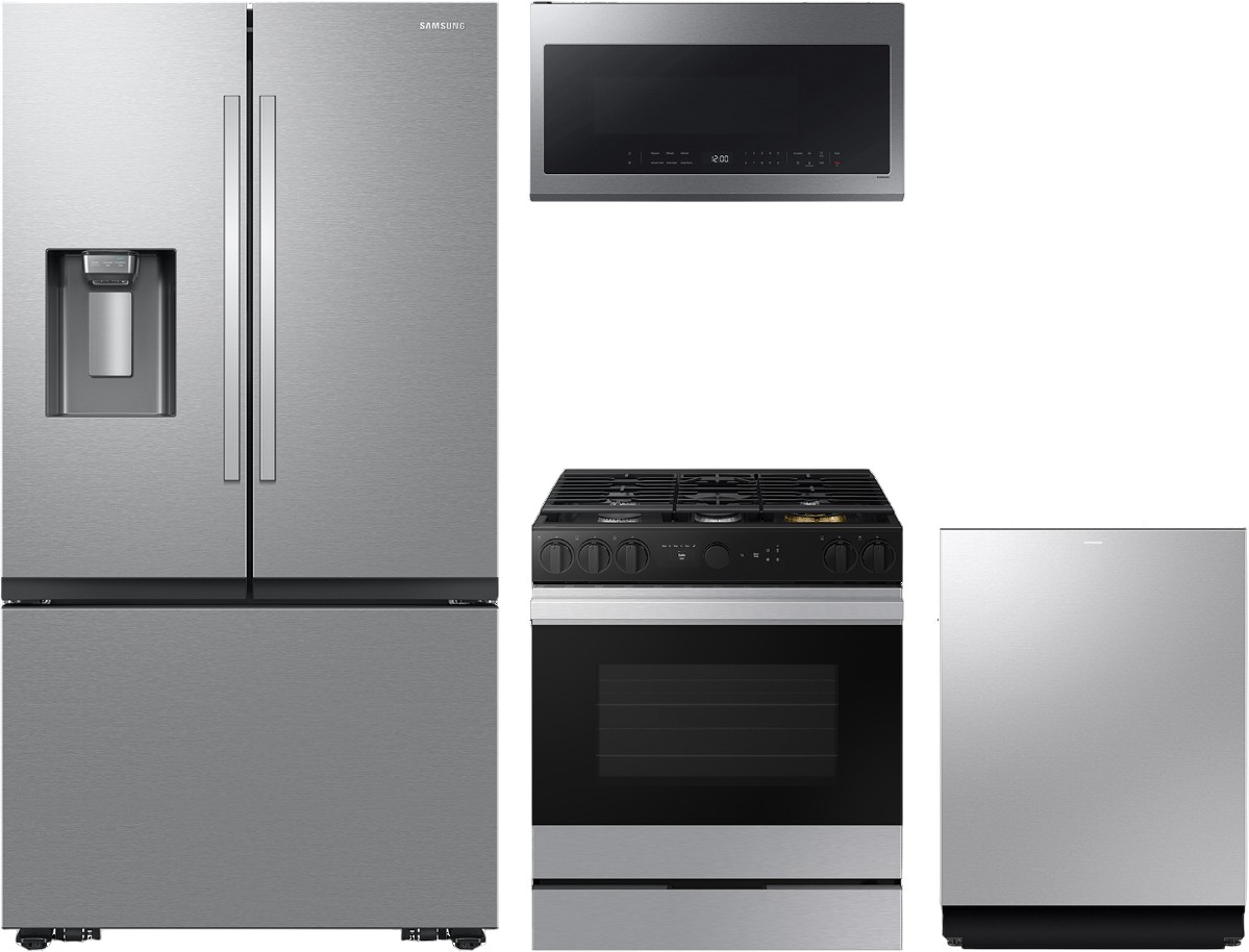 Samsung 4 Piece Stainless Steel Kitchen Package with freestanding French door refrigerator, top control built in smart dishwasher with 3rd rack, slide in gas range, and over the range microwave.Read More